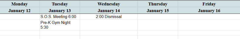 Our Pre-K families are invited to join us for gym night on Tuesday at 5:30. Bring your gym shoes and join in on the fun!