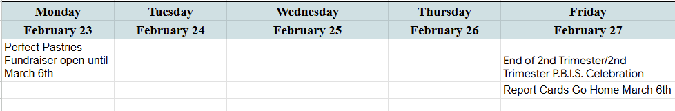 Students came home with information regarding the S.O.S. Perfect Pastries Fundraiser on Wednesday. The sale runs until March 6th. Please see the packet for information.